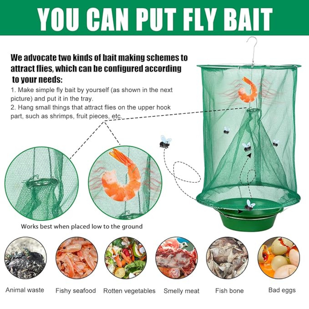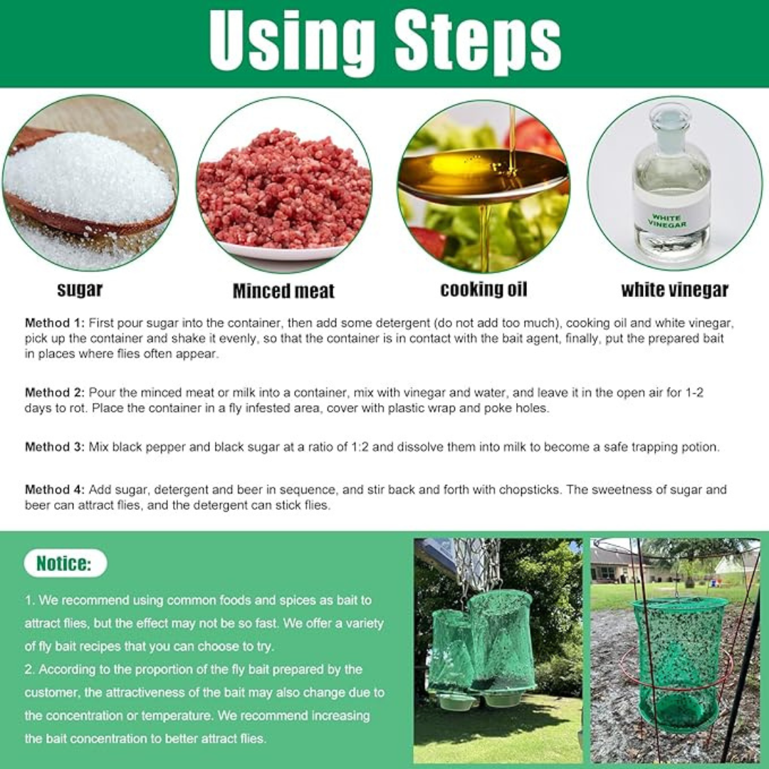 As moscas são atraídas pela comida atractiva colocada no tabuleiro da armadilha para moscas suspensa reutilizável e entram através de um pequeno orifício na parte superior. Uma vez que as moscas voam frequentemente para cima quando tentam fugir, a armadilha reutilizável para moscas garante definitivamente que não podem escapar.